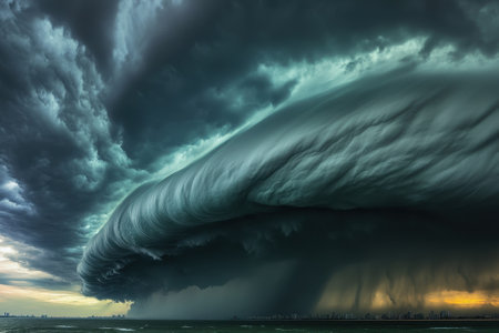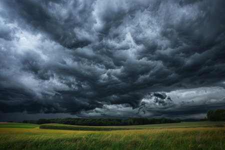 Meteorological showing a dramatic and ominous dark gray storm cloud formation looms in the sky, with swirling textures and heavy rain visible in the distance,...