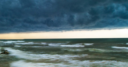 A captivating image of a dark, ominous storm brewing over the ocean, showcasing the raw power and beauty of natures dramatic weather patterns.