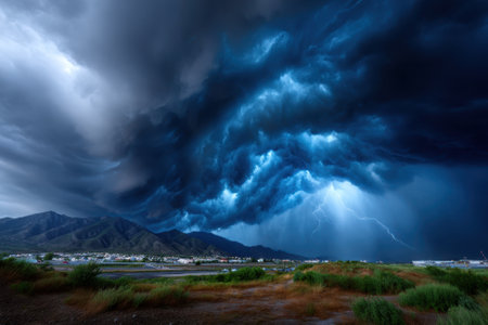 Meteorological showing dramatic dark storm clouds illuminated by bright lightning strikes across the sky keywords:...