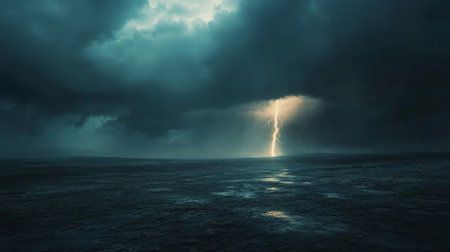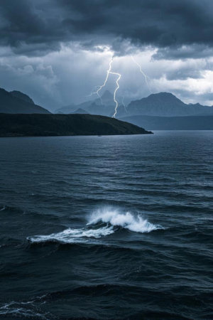 Turbulent ocean waves crash violently under a dark, stormy sky with dramatic lightning illuminating the chaotic...