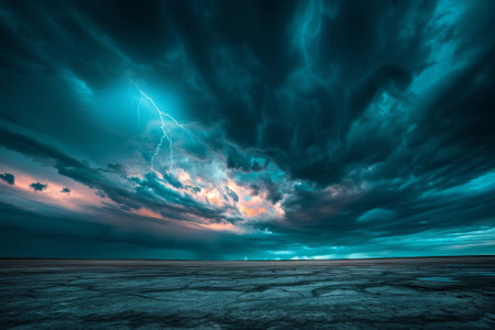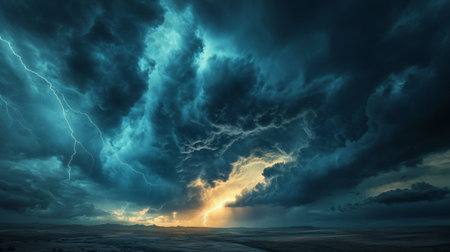 A dramatic image of a powerful thunderstorm with dark, swirling clouds and flashes of lightning illuminating the sky over a desolate landscape.