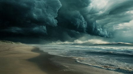 A captivating seascape showcases turbulent waves crashing onto the sandy beach, set against dark, dramatic clouds. The atmosphere evokes a sense of tranquility yet awe, perfect for nature and landscape themes.