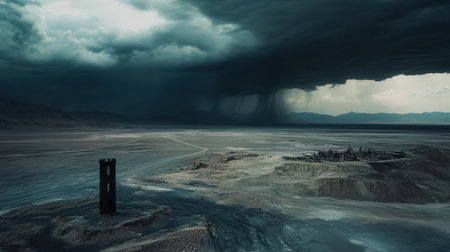 An image captures a coastal scene dominated by a vast, imposing display of dark storm clouds. Heavy rainfall descends towards the ocean surface, creating a stark contrast against the calm water. The composition highlights the raw power of nature, suitable for commercial or editorial applications.