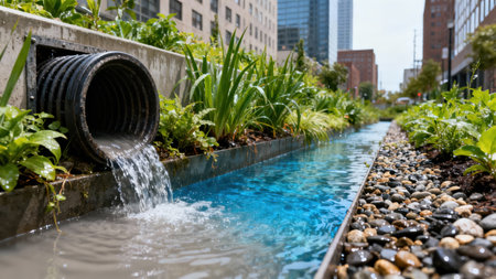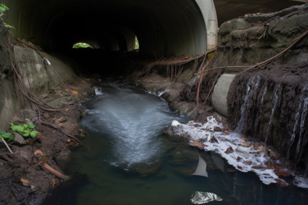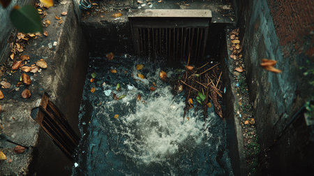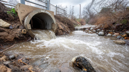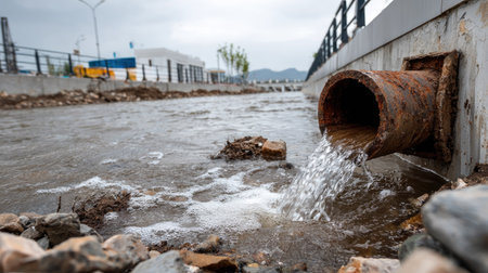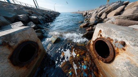 Dirty water flowing from sewer pipes in a gritty 3D scene