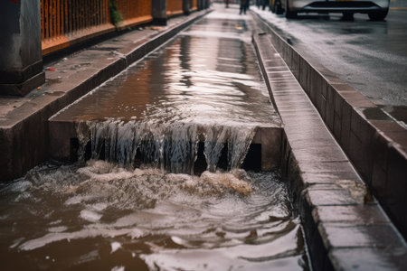sewer water overflowing on the street during heavy rainstorm, created with generative ai