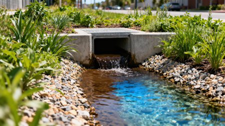 Low angle perspective detailing the concrete outlet structure where murky stormwater spills into a clean, rocky channel bordered by bright green riparian grasses under sunny lighting.