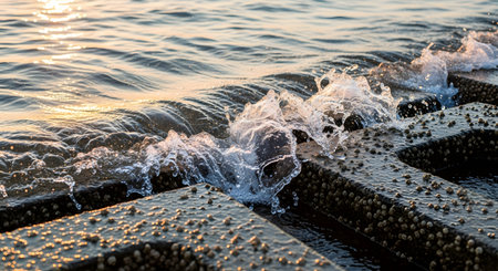 A small ocean wave splashes against a textured concrete breakwater covered in barnacles, captured in motion. The scene is bathed in the warm, golden light of a setting sun, creating a beautiful and peaceful coastal moment.