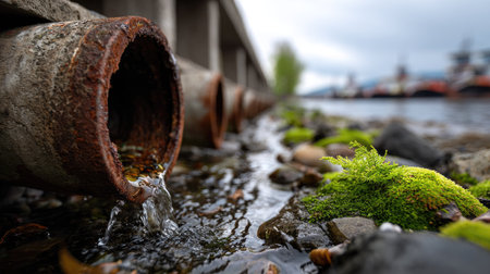 Close-up of waste flowing from industrial pipes into a natural stream, highlighting environmental pollution