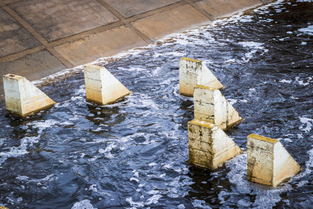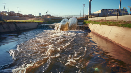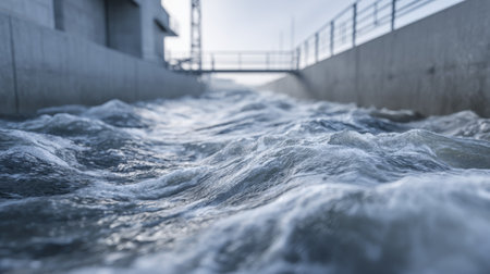 Flowing reclaimed water cascading over industrial sluice gates. Generative AI