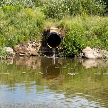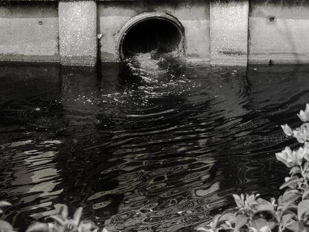 City Polluting the environment. Drainage pipe discharging waist products directly into the river, shot with copy-space