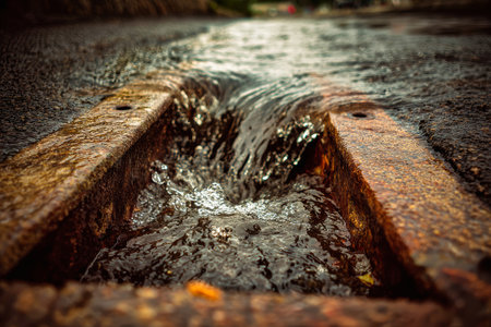 Water rushes through a storm drain hatch, sparkling under sunlight, creating ripples and a serene atmosphere in an urban environment.