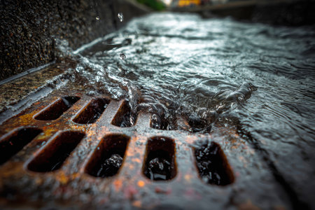 Rainwater collects and rushes through the metal storm drain hatch, creating ripples as it disappears underground after a heavy downpour in the city.