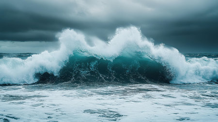 Majestic ocean waves crash against each other beneath a dramatic sky filled with dark clouds. The scene portrays the raw energy and beauty of nature's elements.