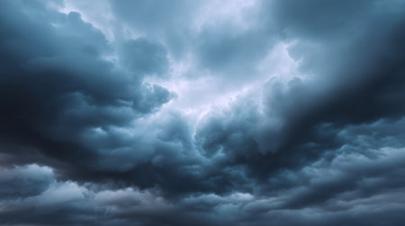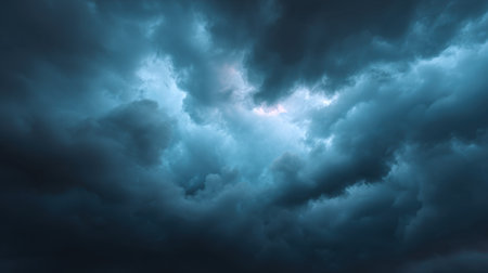 A captivating image of dark stormy clouds fills the sky with shades of blue and gray, evoking a sense of power and beauty in nature.