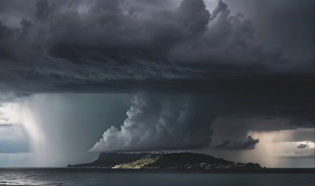 A dramatic storm rages over a small island off the coast, creating a beautiful and dangerous scene