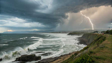 Generative AI Image of Horrible Storm with Lightning Strike on Ocean Waves with Cliff