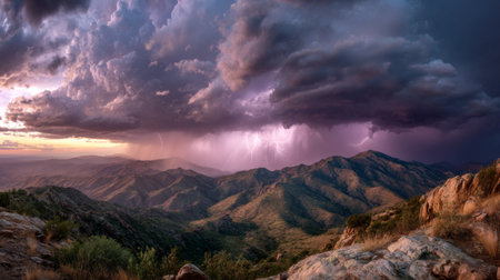 A breathtaking mountain landscape showcasing dramatic storm clouds and vivid lightning during sunset. The scene captures the beauty of nature in a tranquil, serene setting.