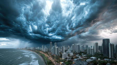 A powerful storm approaches coastal town, creating dramatic skyline