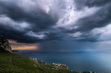Dramatic thunderstorm over the sea at sunset. Nature background