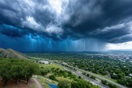 A dramatic scene featuring a blue sky during a thunderstorm, with dark clouds gathering over a landscape. The intense atmosphere captures the power of nature, perfect for projects needing a moody and dynamic background.