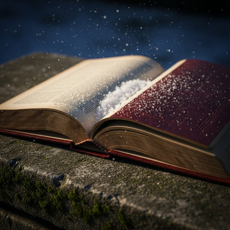 image of open antique book on wooden table with glitter overlay