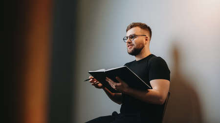panoramic shot of african american actor holding scenario on stage during rehearse