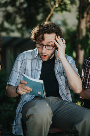 Young student reacting to a notebook outdoors looking surprised