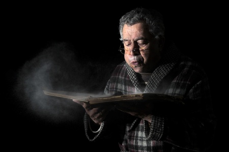 Senior man blowing dust of a very old book isolated in black