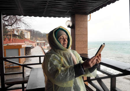 Portrait of an elderly woman in a raincoat walking in the rain. She looks at the sea on a rainy day.Healthy lifestyle of the elderly