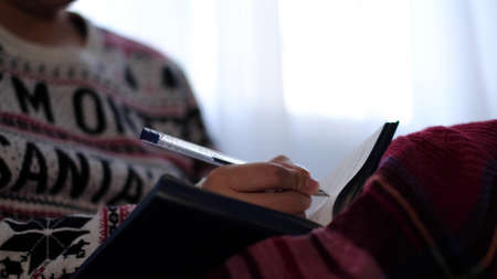 unrecognizable woman in warm knitted sweater writes down plans or tasks for the new year.