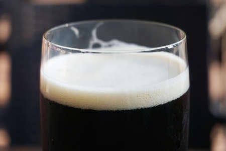 pint glass of dark stout beer with foam stands on a wooden table in a bar