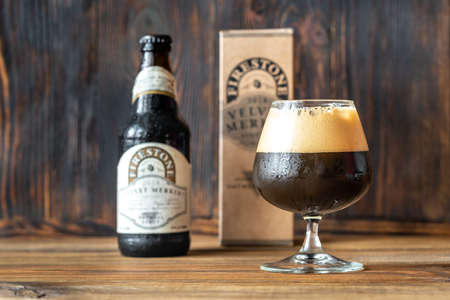 SUMY, UKRAINE - NOVEMBER 17, 2019: Glass and bottle of Velvet Merkin Beer. Velvet Merkin is bourbon barrel-aged oatmeal stout by Firestone Walker brewing company.