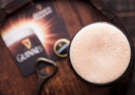 LONDON, UK - APRIL 27, 2018: Original glass of Guinness draught stout beer on top of old wooden barrel with beer coaster and opener. Guinness beer has been produced since 1759 in Dublin, Ireland.