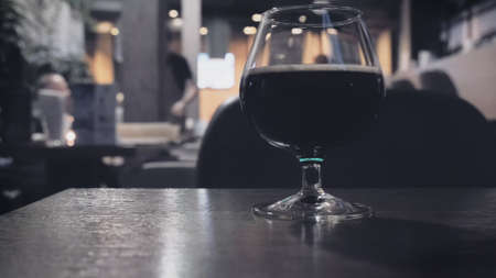 Dark bar with a foaming drink on the table. The concept of relaxing after a working day in a quiet cafe