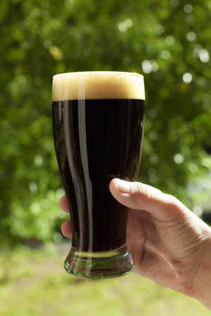 Man's hand holding glass of dark foam beer on background of green summer foliage