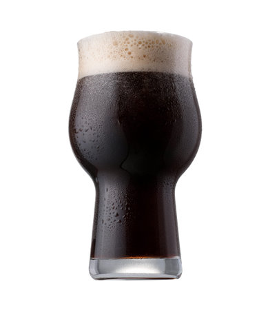 A chilled stout glass showcases a rich, deep hue topped with a thick, frothy layer, while tiny droplets slide down its cool, misted surface.
