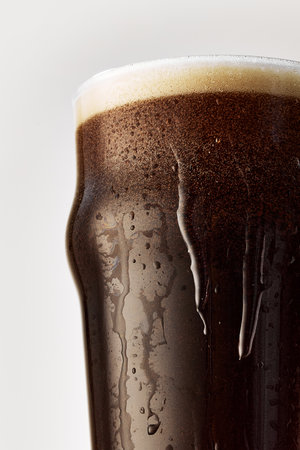Close-up of pint glass filled with dark, cold, foamy craft beer with droplets on condensation on glass against grey studio background. Concept of food and drink, celebration, Oktoberfest, beverage. Ad