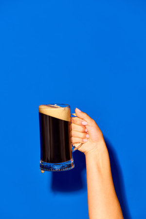 Female hand holding mug with dark, foamy beer isolated on blue background. Traditional taste. Poster