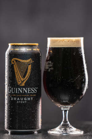 Guinness is a dark Irish dry stout that originated in the brewery of Arthur Guinness at St. Jamess Gate Dublin Ireland, in 1759. UK, Bedford, December 27, 2020
