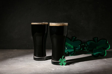 Glasses of dark beer with clover and plastic eyeglasses for St. Patrick's Day celebration on gray grunge table against black background