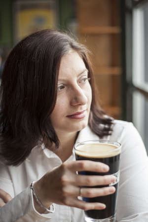Close-up detail of a glass of cold stout lager in a traditional British pub. Windsor, United Kingdom. Drinks and cuisine.