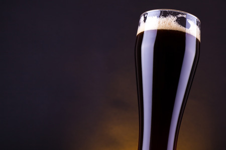 Glass of brown beer on a black background with copy space - Cold and refreshing alcoholic soft drink for summer