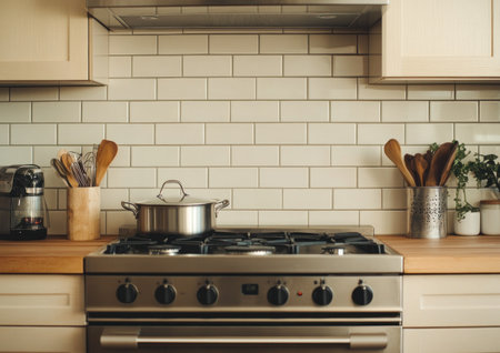 A photo of the stovetop in an off-white kitchen with a subway-style tile backsplash, a pot on one side and neatly arranged utensils next to it. The oven is stainless steel and has no hood over it. There are two light wood cabinets above the range. In front, there is a wooden countertop. Taken using a Canon EOS R5 camera. --ar 7:5 --v 6.1 Job ID: 62034644-dcf5-4231-b227-287ba0d03929