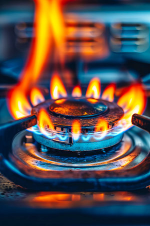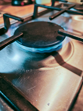 Blue gas flame burning brightly, flickering beneath cast iron pan support on modern kitchen stove, radiating intense heat and culinary energy