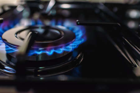 Closeup shot of blue fire from domestic kitchen stove. Gas cooker with burning flames propane gas. burning gas stove