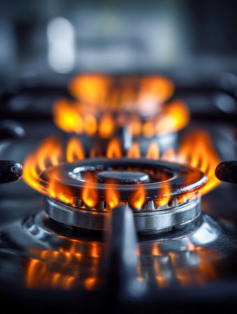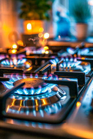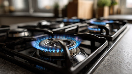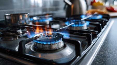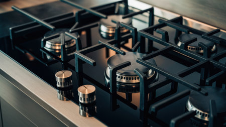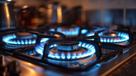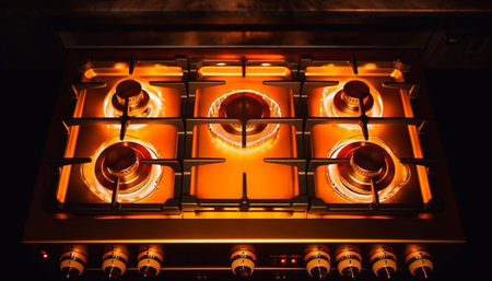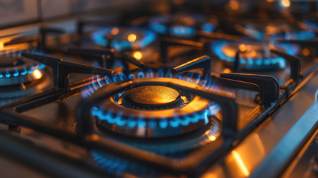 Close up of a modern kitchen gas stove with glowing burners, warm lighting, and a cozy kitchen atmosphere Perfect for cooking, home, and culinary themes