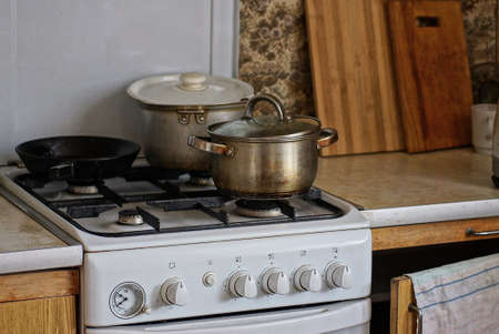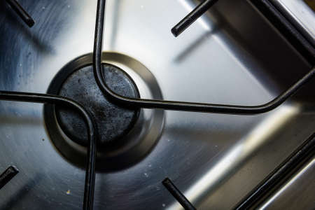Gas cooker close-up. Kitchen necessity. Four burners. Food