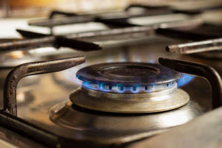 Burning gas burner in the kitchen, close-up, selective focus