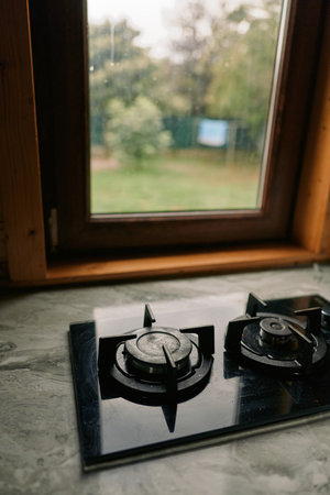 Gas stove burner on a kitchen counter beside a window, showcasing a quiet domestic scene with natural light, reflective metal surface, and simple home ambience