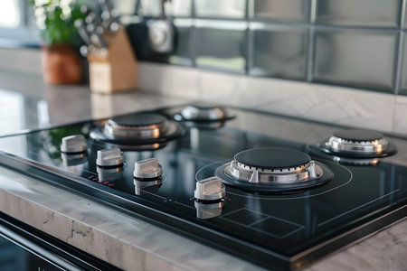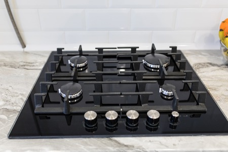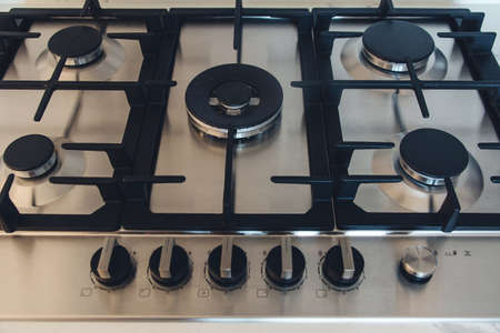 Kitchen gas stove, close up. New gas stove appliance and countertop surface at modern kitchen. Modern kitchen stove cook.